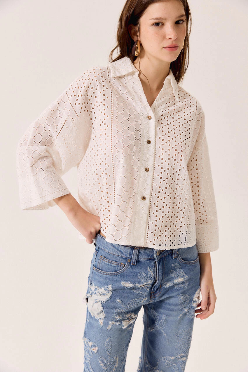 Blusa manga corta de broderie. Composición: 100% Algodón.